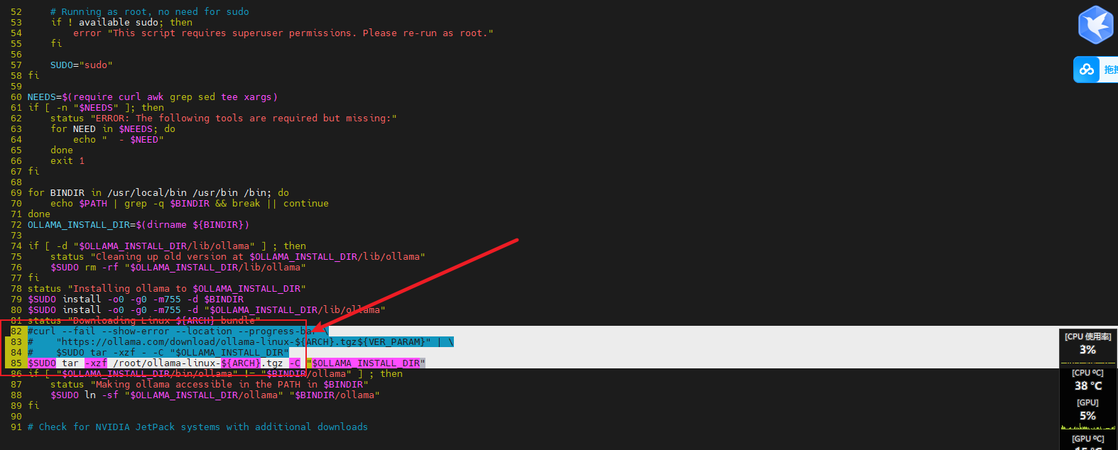 $SUDO tar -xzf /root/ollama-linux-${ARCH}.tgz -C "$OLLAMA_INSTALL_DIR" #在85行添加安装包路径