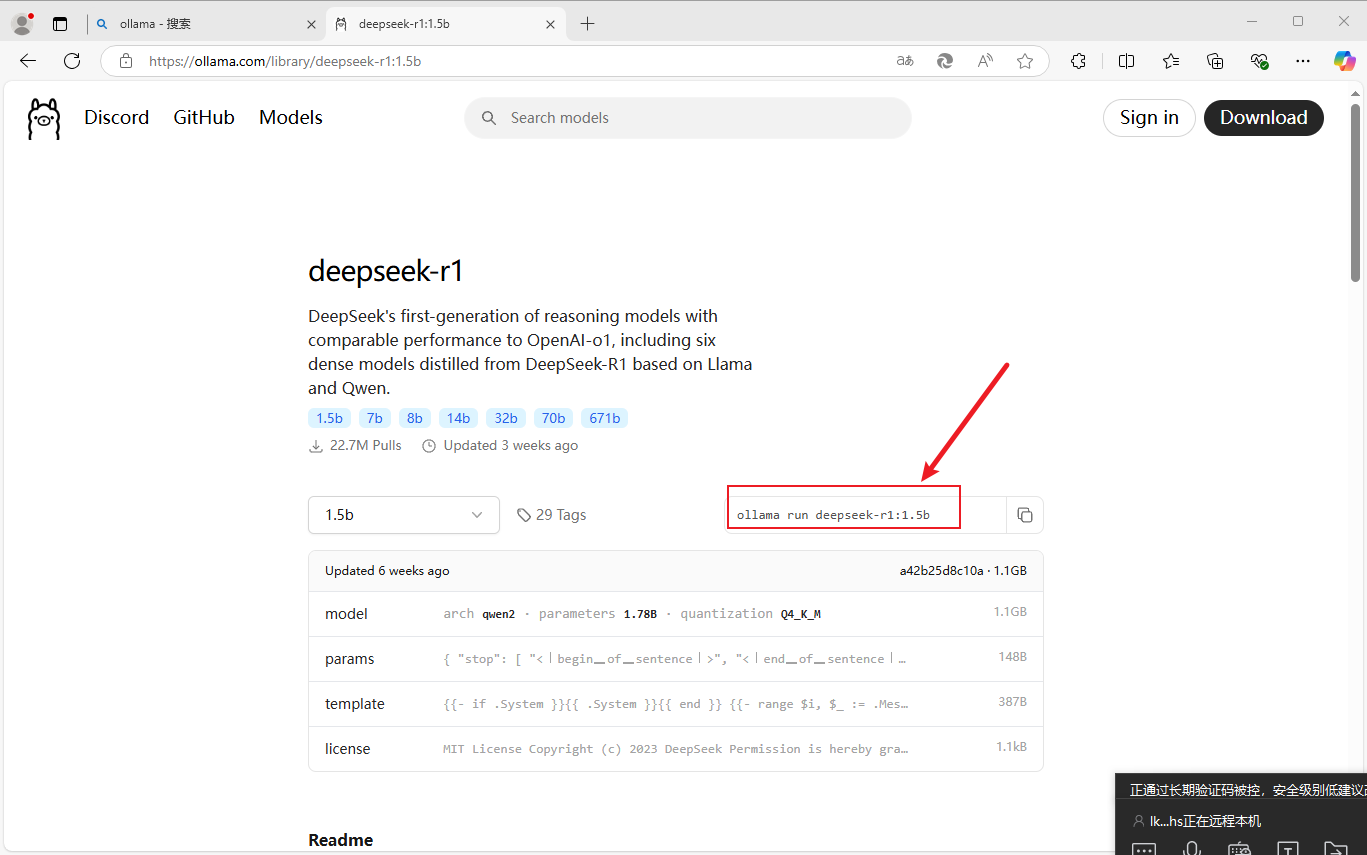 - 从 ollama 官网复制 deepseek 安装命令并执行