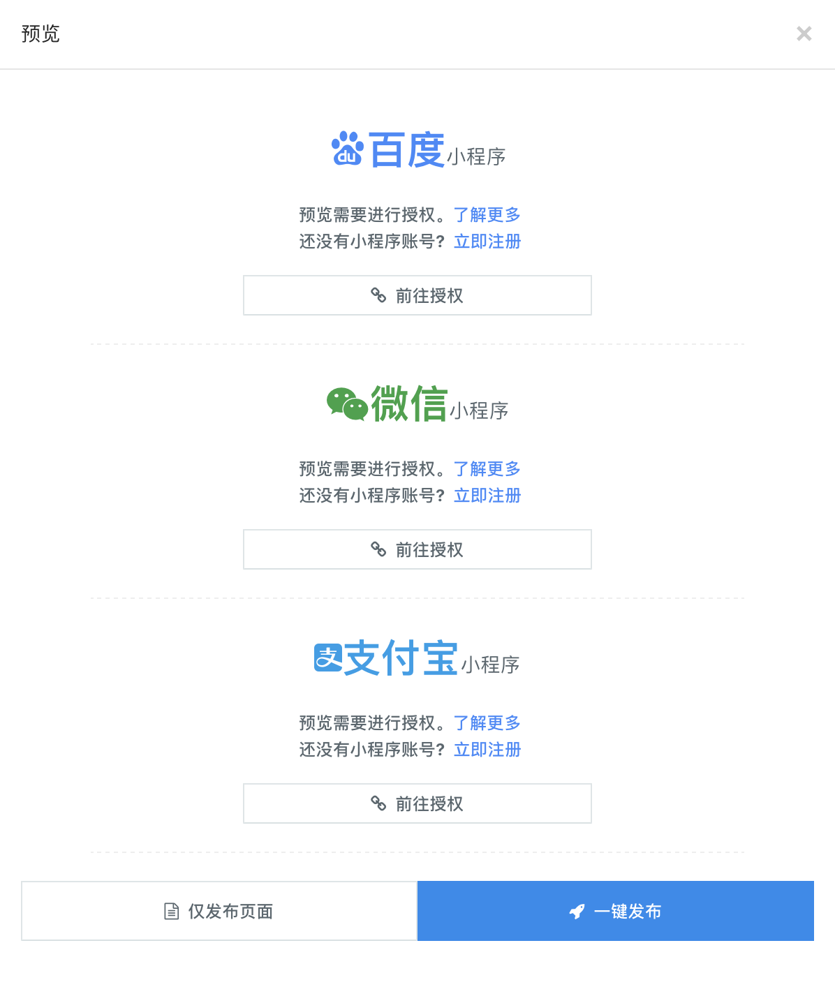 若暂时未给自己的小程序授权,点击了解更多,按照对应渠道的授权规则完成授权即可,完成授权后,上面的弹框中『前往授权』按钮会变成『发起审核』,同时对应小程序右侧还回出现预览二维码,供您预览自己的小程序。确认无误后,可以点击每个小程序的『发起审核』按钮来分别发起审核或点击『一键发布』按钮自动将所有完成授权的小程序发起审核。