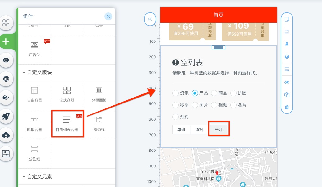 自由列表支持绑定各种类型的动态数据,默认是纵向滚动加载的模式,对于多列的自由列表只要布局样式设置选择横向滚动即可快速实现动态列表的横向滑动效果。