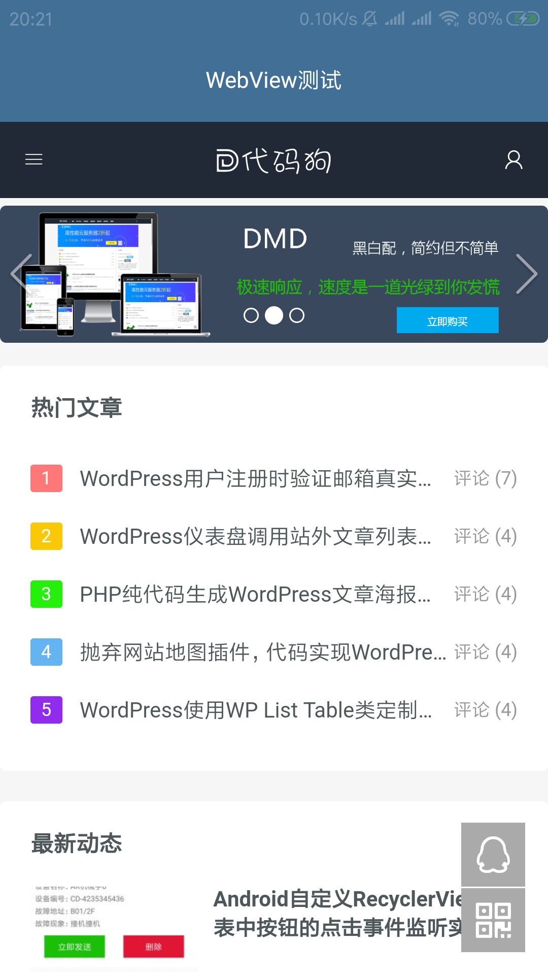 public class MainActivity extends AppCompatActivity { private QMUITopBarLayout topbar; private QMUIWebViewContainer qmuiwebcon; QDWebView mWebView; @Override protected void onCreate(Bundle savedInstanceState) { super.onCreate(savedInstanceState); setContentView(R.layout.activity_main); QMUIStatusBarHelper.translucent(this); qmuiwebcon= (QMUIWebViewContainer) findViewById(R.id.webview_container); topbar= (QMUITopBarLayout) findViewById(R.id.topbar); topbar.setTitle("WebView测试").setTextColor(ContextCompat.getColor(this,R.color.qmui_config_color_white)); topbar.setBackgroundColor(ContextCompat.getColor(this,R.color.qmui_btn_blue_bg)); mWebView = new QDWebView(this); boolean needDispatchSafeAreaInset = needDispatchSafeAreaInset(); qmuiwebcon.addWebView(mWebView, needDispatchSafeAreaInset); mWebView.loadUrl("https://www.daimadog.com"); qmuiwebcon.setCustomOnScrollChangeListener(new QMUIWebView.OnScrollChangeListener(){ @Override public void onScrollChange(View v, int scrollX, int scrollY, int oldScrollX, int oldScrollY) { onScrollWebContent(scrollX, scrollY, oldScrollX, oldScrollY); } }); mWebView.setDownloadListener(new DownloadListener() { @Override public void onDownloadStart(String url, String userAgent, String contentDisposition, String mimetype, long contentLength) { } }); } protected void onScrollWebContent(int scrollX, int scrollY, int oldScrollX, int oldScrollY) { } protected boolean needDispatchSafeAreaInset() { return false; } }