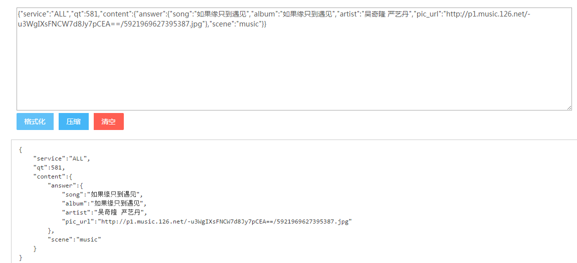 function format(txt,compress/*是否为压缩模式*/){/* 格式化JSON源码(对象转换为JSON文本) */ var indentChar = ' '; if(/^/s*$/.test(txt)){ alert('数据为空,无法格式化! '); return; } try{var data=eval('('+txt+')');} catch(e){ alert('数据源语法错误,格式化失败! 错误信息: '+e.description,'err'); return; }; var draw=[],last=false,This=this,line=compress?'':'/n',nodeCount=0,maxDepth=0; var notify=function(name,value,isLast,indent/*缩进*/,formObj){ nodeCount++;/*节点计数*/ for (var i=0,tab='';i<indent;i++ )tab+=indentChar;/* 缩进HTML */ tab=compress?'':tab;/*压缩模式忽略缩进*/ maxDepth=++indent;/*缩进递增并记录*/ if(value&&value.constructor==Array){/*处理数组*/ draw.push(tab+(formObj?('"'+name+'":'):'')+'['+line);/*缩进'[' 然后换行*/ for (var i=0;i<value.length;i++) notify(i,value[i],i==value.length-1,indent,false); draw.push(tab+']'+(isLast?line:(','+line)));/*缩进']'换行,若非尾元素则添加逗号*/ }else if(value&&typeof value=='object'){/*处理对象*/ draw.push(tab+(formObj?('"'+name+'":'):'')+'{'+line);/*缩进'{' 然后换行*/ var len=0,i=0; for(var key in value)len++; for(var key in value)notify(key,value[key],++i==len,indent,true); draw.push(tab+'}'+(isLast?line:(','+line)));/*缩进'}'换行,若非尾元素则添加逗号*/ }else{ if(typeof value=='string')value='"'+value+'"'; draw.push(tab+(formObj?('"'+name+'":'):'')+value+(isLast?'':',')+line); }; }; var isLast=true,indent=0; notify('',data,isLast,indent,false); return draw.join(''); }format(json,true);表示压缩json字符串。