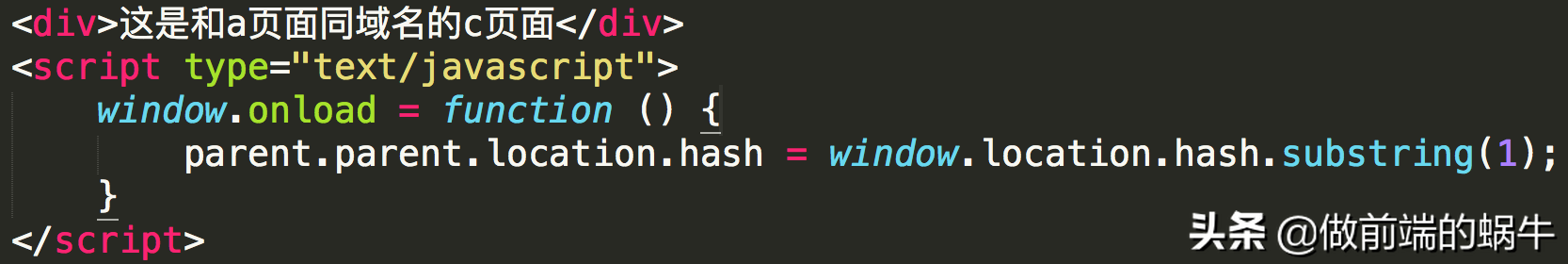b页面改变a页面地址hash值,a页面监听地址栏的变化获取相应的数据,但是a、b页面不同源,b页面不能直接操作改变a页面地址的hash值。